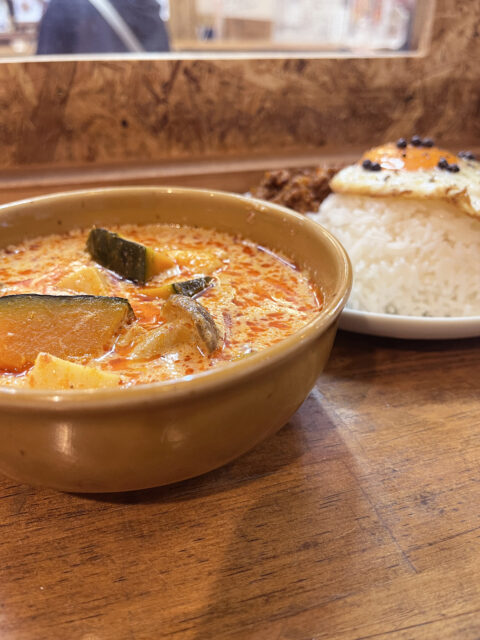 ■旬の南瓜と近江鴨を使ったレッドカレープリックバンチャンという大きめの辛味が少ない唐辛子を使ってペーストを作ります。真っ赤な色はかなり辛そうに見えますが、グリーンカレーに比べるとマイルドな仕上がりになります。